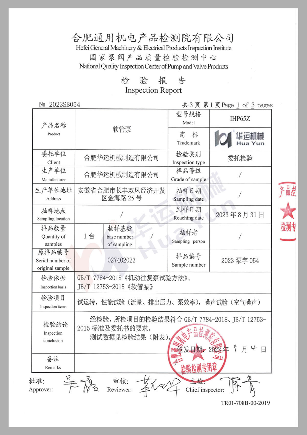 合肥華運(yùn)軟管泵國(guó)際認(rèn)可檢測(cè)報(bào)告